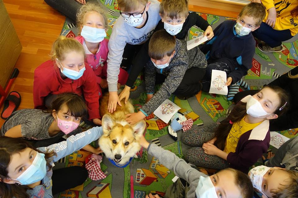Tentokrát Vilík "vyučoval" český jazyk, přesněji čtení. Děti mu přečetly legendu o vzniku plemene, kterého je zástupcem. Pak jsme společně pátrali, jestli může být legenda pravdivá - a zjistili jsme, že nejspíš ano! Za vzorné čtení delšího textu dostali druháci mandalu, kterou si mohli vybarvit. Mandala byla poskládaná z různých předmětů, které pes potřebuje ke spokojenému životu. Povídali jsme si pak o tom, co a proč pes potřebuje, jak o něj pečovat a co pro něj je a není vhodné.