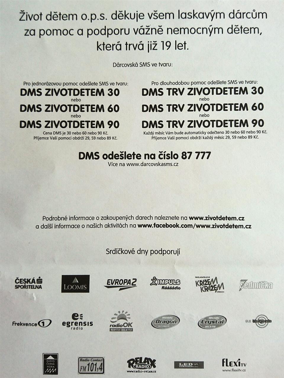 Pokud byste raději využili příspěvek formou dárcovské SMS, cena činí 30,-, 60,- nebo 90,-Kč. Tvar SMS a číslo naleznete na druhé straně letáčku, který obdržíte do třídy.